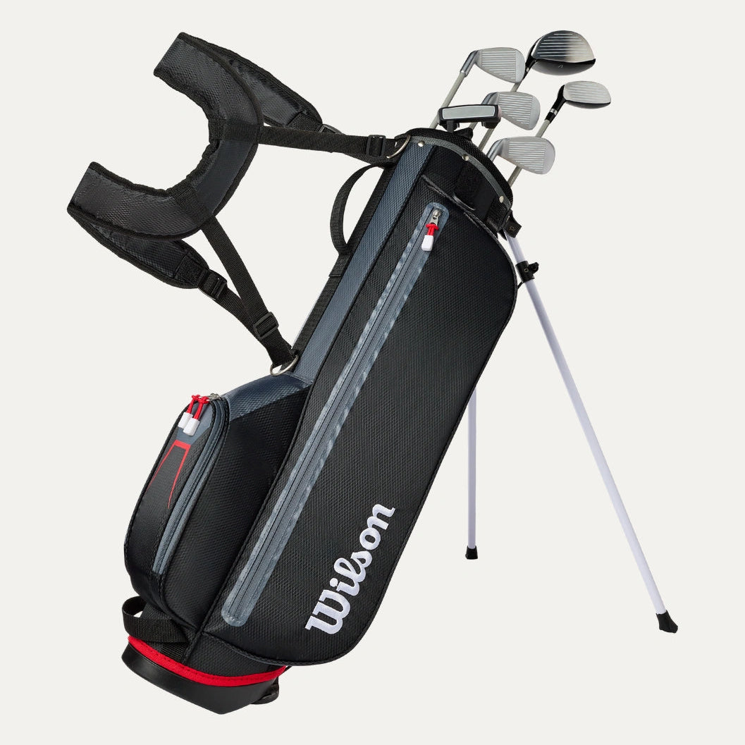 Wilson junior sets are engineered to help young players develop their skills and build confidence on the course. Each club is built to be lightweight and forgiving with shorter club lengths, flexible shafts, and oversized club heads. Every set is tailored to meet the needs of growing players. This 9-piece set includes: Driver // Hybrid // 5, 7-iron // Wedge // Putter // Bag // 2 Headcovers.