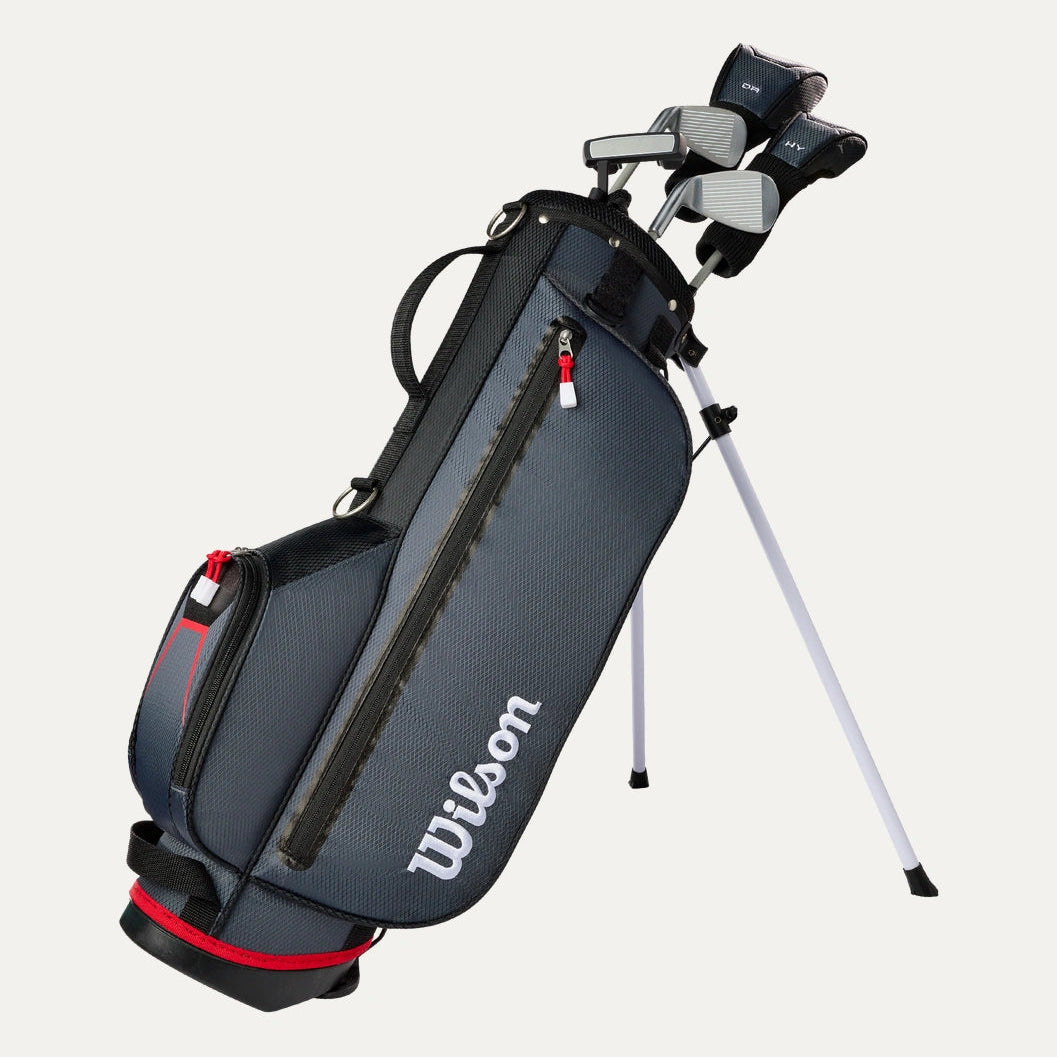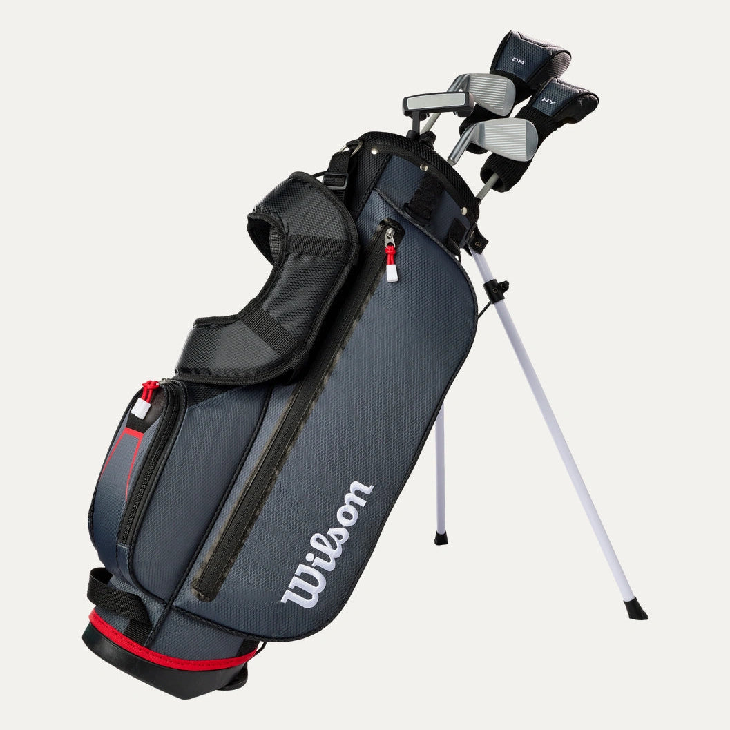 Wilson junior sets are engineered to help young players develop their skills and build confidence on the course. Each club is built to be lightweight and forgiving with shorter club lengths, flexible shafts, and oversized club heads. Every set is tailored to meet the needs of growing players. This 8-piece set includes: Driver // Hybrid // 7-iron // Wedge // Putter // Bag // 2 Headcovers.