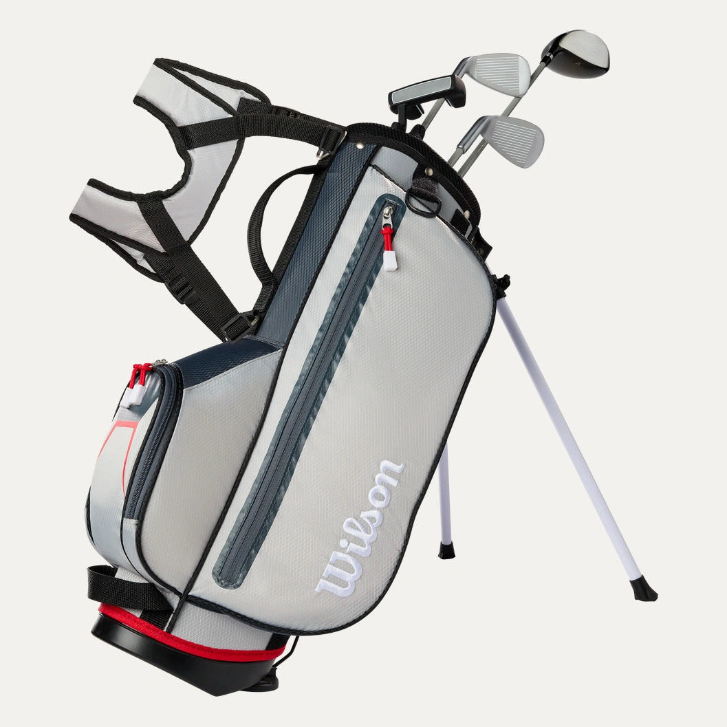 Wilson junior sets are engineered to help young players develop their skills and build confidence on the course. Each club is built to be lightweight and forgiving with shorter club lengths, flexible shafts, and oversized club heads. Every set is tailored to meet the needs of growing players. This 6-piece set includes: Driver // 7-iron // Wedge // Putter // Bag // 1 Headcover.