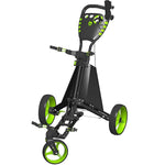 The Easy Drive push cart features a swiveling front wheel and the easiest / fastest folding mechanism on the market. A single push of a button easily folds the cart. This cart features a lightweight aluminum frame, airless low maintenance tires, foot brake, and adjustable handle. All carts come complete with scorecard holder, storage compartment, umbrella holder and mesh bag.