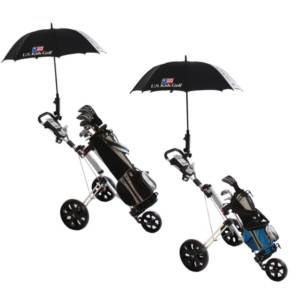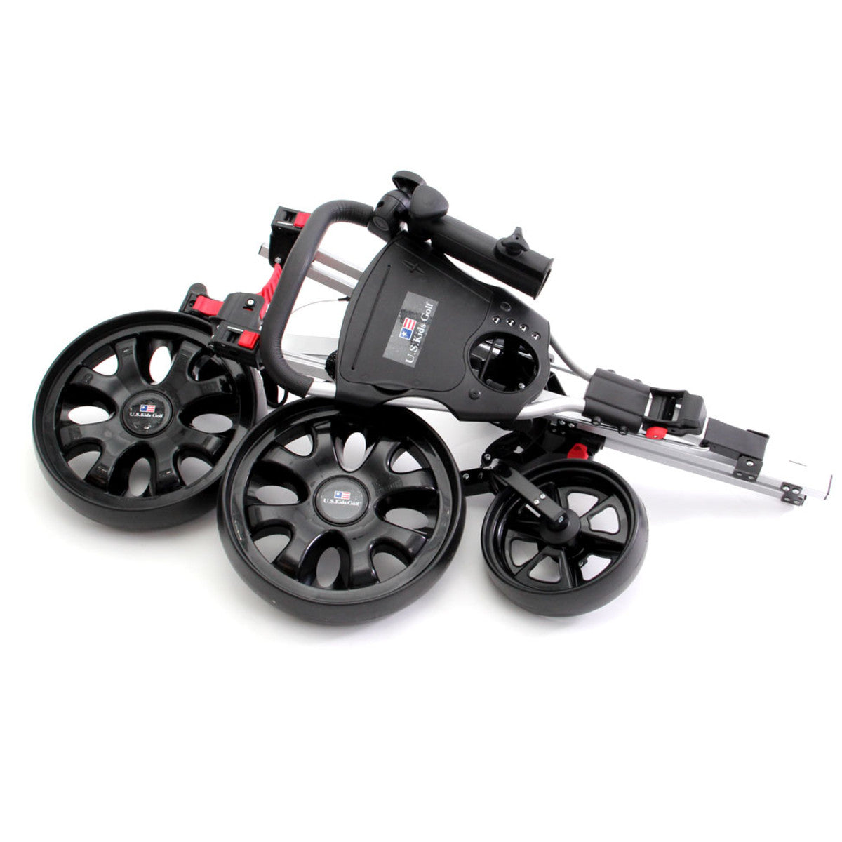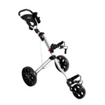 Lightweight 3 wheel push cart. Adjustable top bracket to fit golf bags 21.5" (UL42) and above. The dual strap secures the golf bag to the cart.
