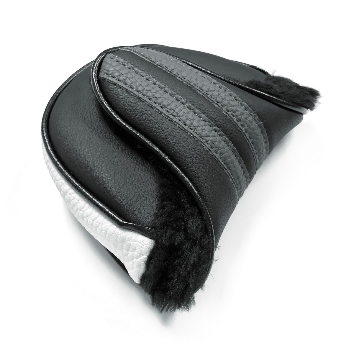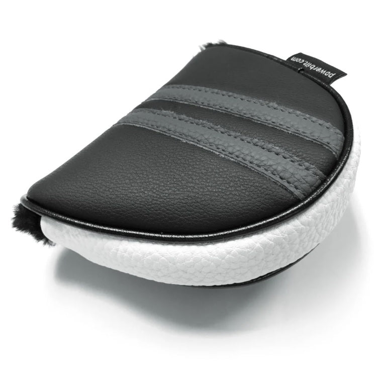 Special Edition Powerbilt vintage black/charcoal mallet putter headcover is constructed from foam-backed polyurethane, which looks like leather and provides maximum protection. Features racing strips on the sole, fur-lined inside and Velcro closure. Fits both RH and LH standard sized mallet style putters.