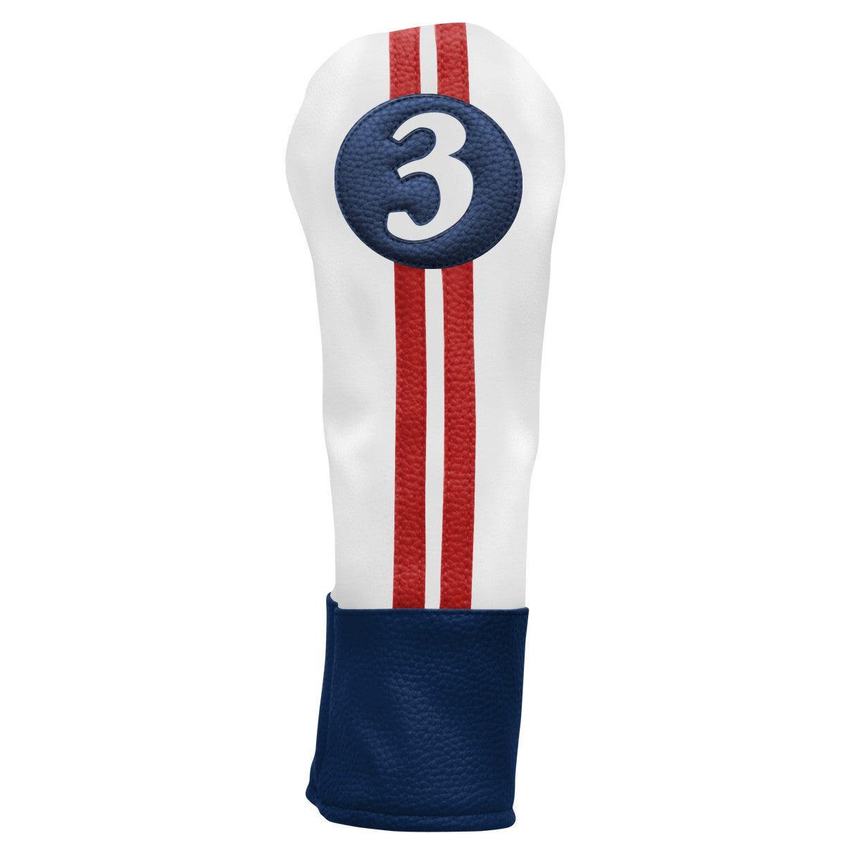 These retro or vintage style headcovers are constructed from foam-backed polyurethane, which looks like leather and provides maximum protection. Form-fitting design available as an individual driver (fits up to 520cc), fairways (3, 5 and X) as well as an H (hybrid or Rescue) feature racing strips on front and plain in the back.