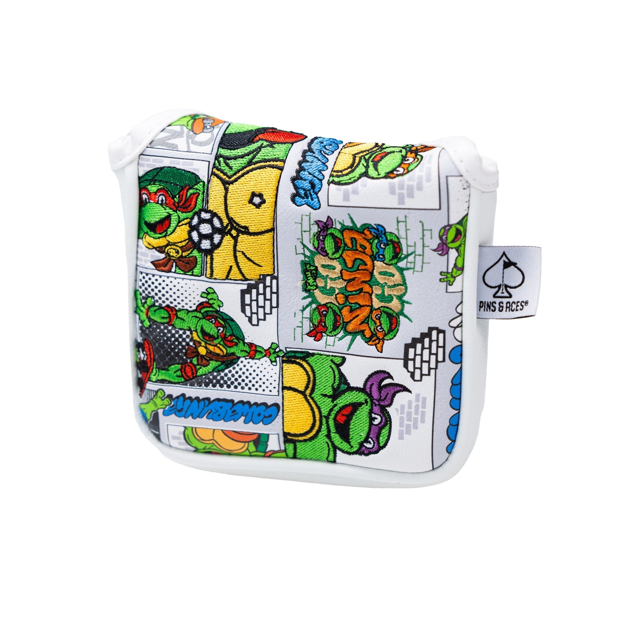 Unleash your inner hero on the golf course with the Pins & Aces x Teenage Mutant Ninja Turtles Collection 2.0 Mallet Head Cover. Turn heads on the course with the classic comic strip design that pays homage to the beloved TMNT characters, bringing a playful and nostalgic vibe to your golf gear. Crafted with precision and durability, the head cover ensures your driver stays protected in style. The vibrant colors and iconic comic strip graphics make this limited-edition release a must-have for golfers who crave a unique blend of pop culture and performance. Transform your golf bag into a conversation starter and let the Teenage Mutant Ninja Turtles Collection drive your game to new heights. Cowabunga, golfers – protect your putter with flair!