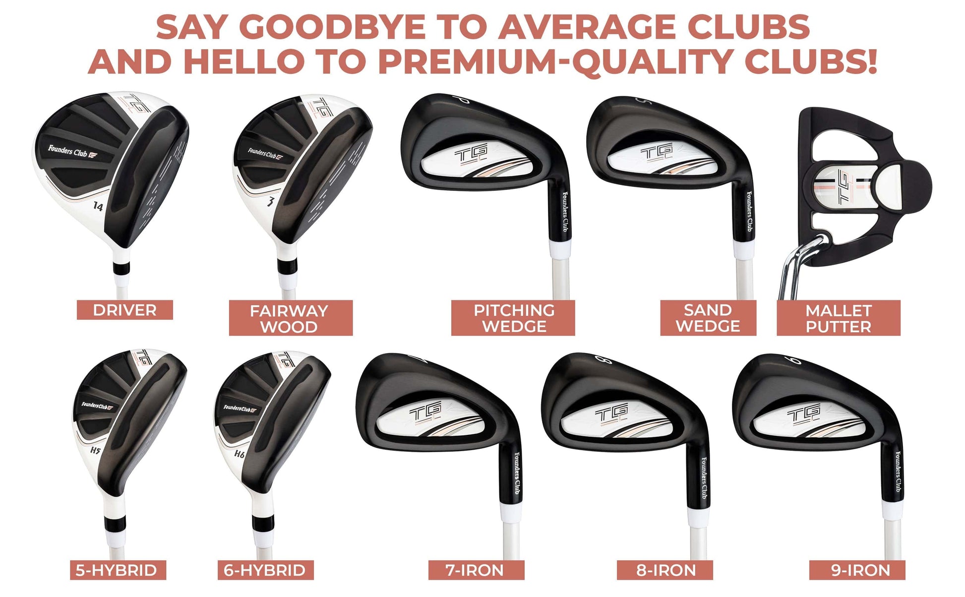 WHAT’S INCLUDED- Make golfing easy and stylish with the Founder Club Women’s TG2 Golf Club Set. This 10-club set comes with a sleek, matte black finish and a durable dual strap stand-style bag and 5 head covers to protect your favorite clubs. The club set includes a Driver, Fairway Wood, 5 & 6 Hybrid Iron, 7-8-9-PW-SW Irons, and a mallet putter.