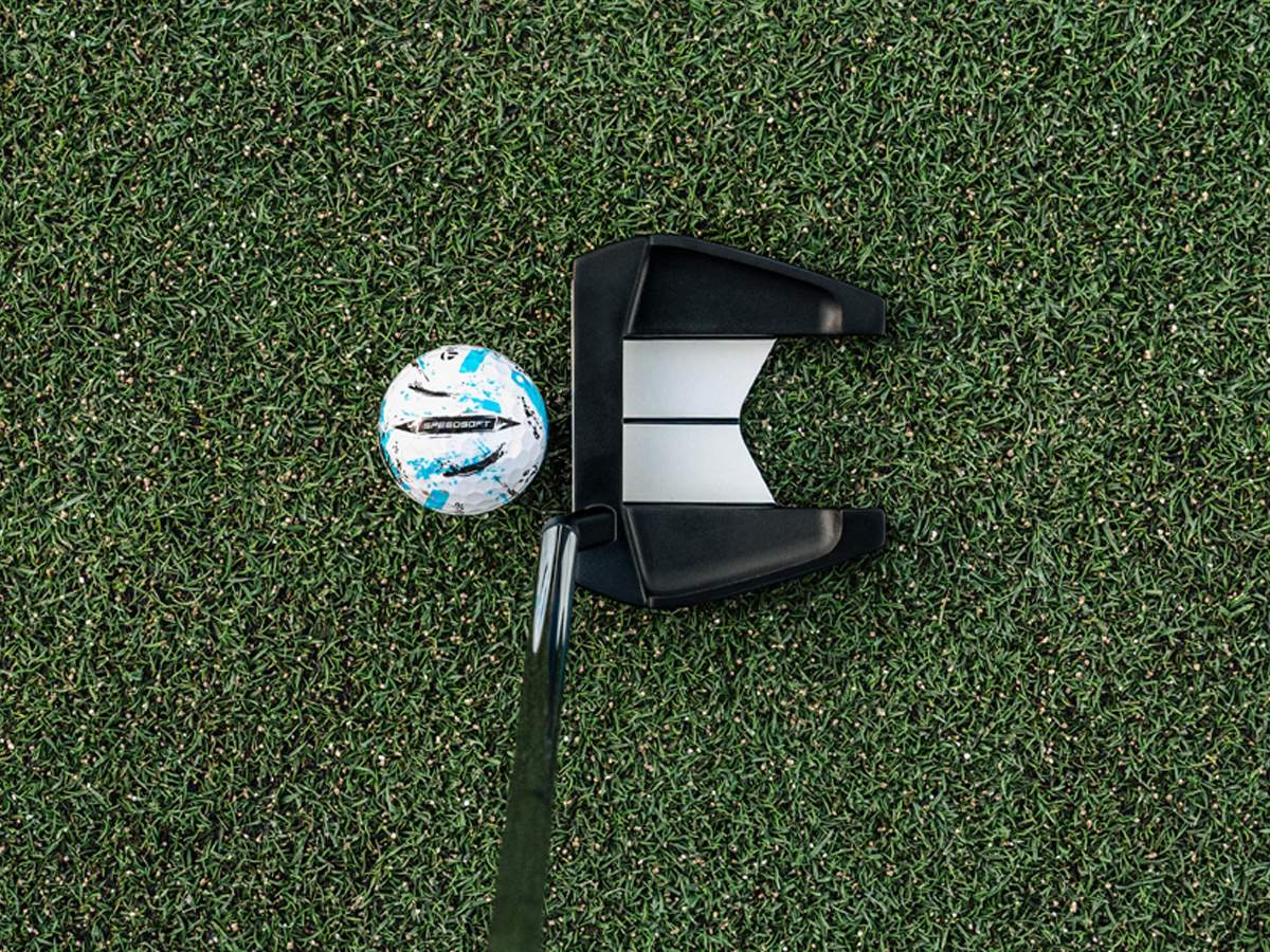 The Spider Splitback putter has sharp, definitive lines and symmetrical wings that make alignment easy while providing ample stability. The Pure Roll™ insert allows for exceptional feel while also promoting end-over-end roll.
