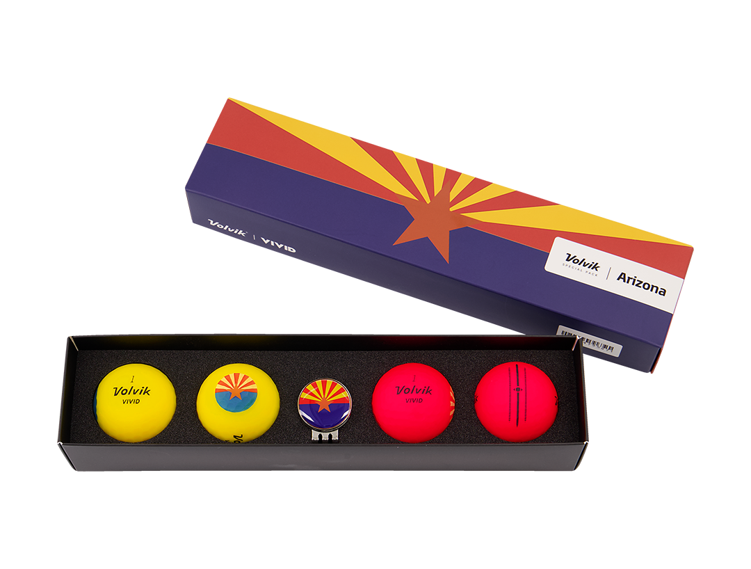 The world's first and best selling matte finish golf ball is now available in limited state edition! Show your state loyalty and start spotting your balls easily with a box of state Vivids from Volvik. Each box contains a 6 balls featuring a state logo, a heavy duty high quality ball marker with the state logo and a convenient magnetic clip for the ball marker.