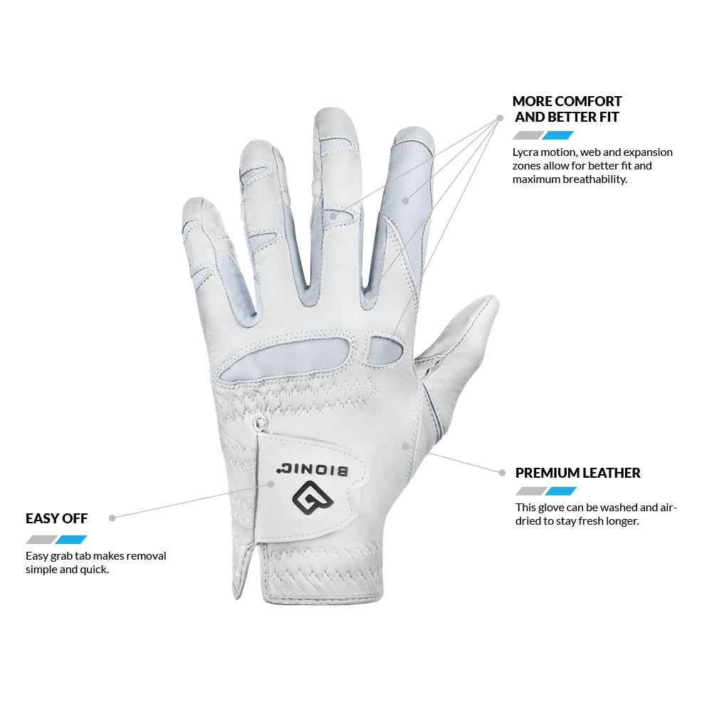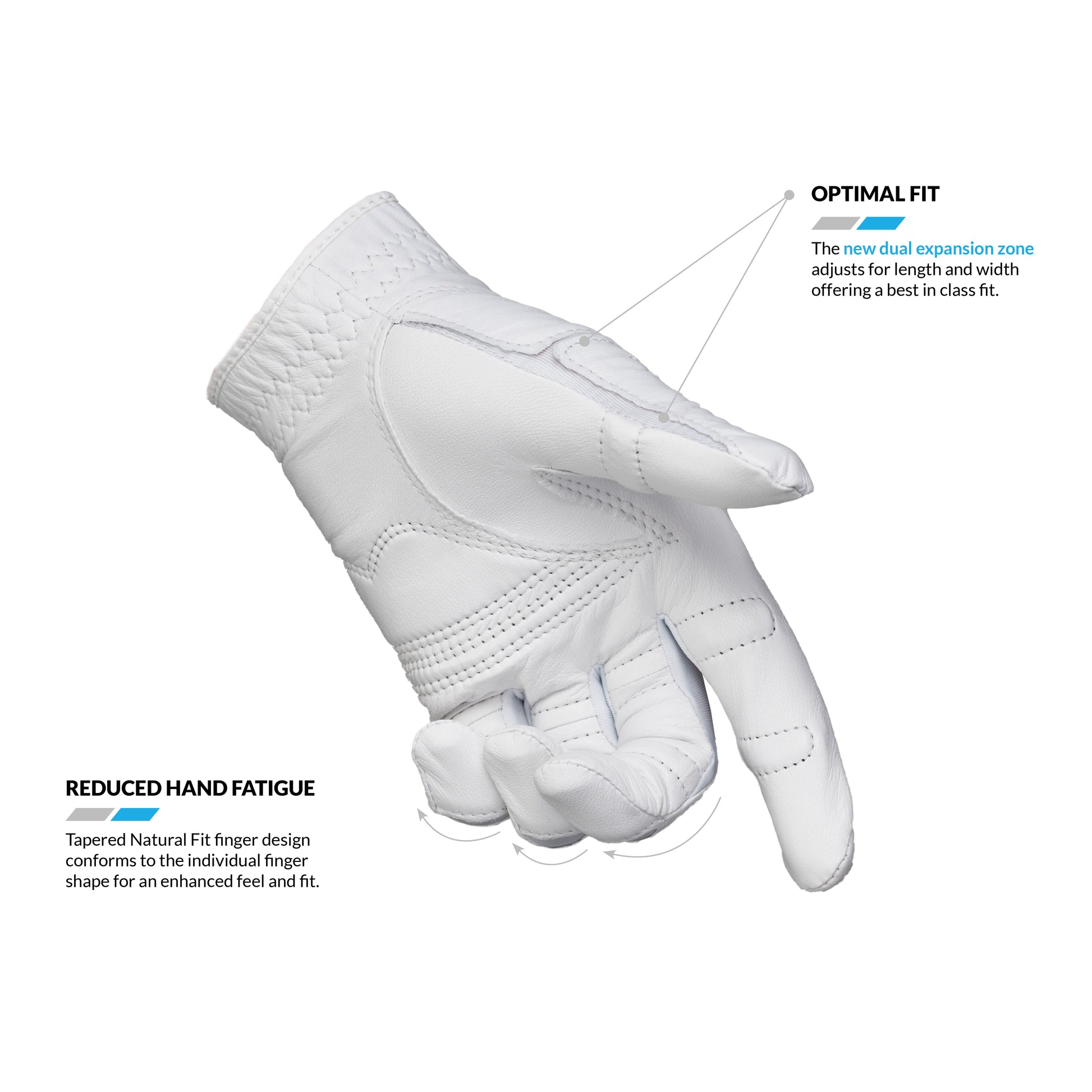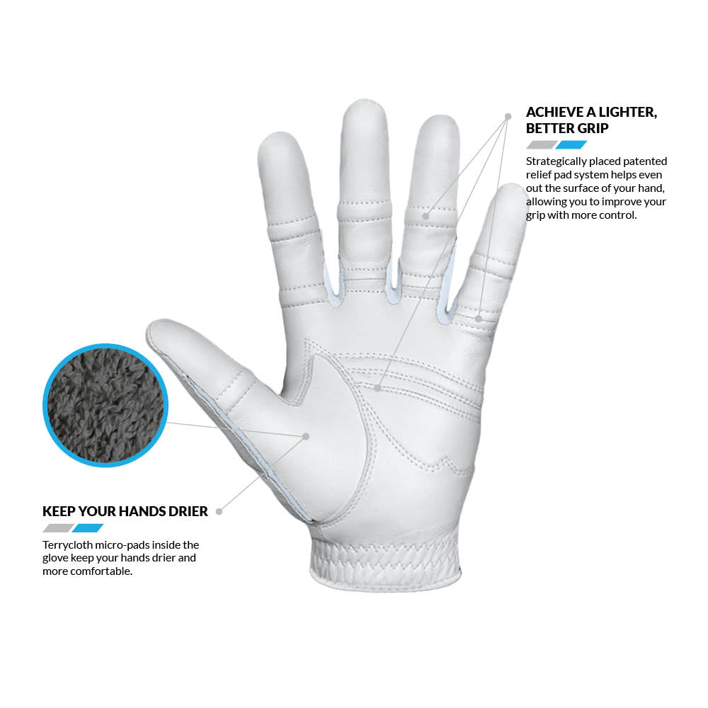 The NEW StableGrip® 2.0 Golf glove offers all your favorite features plus a NEW, innovative Dual Expansion Zone Thumb. This one-of-a-kind feature adjusts to any size thumb’s length and width providing a best in class fit. The Bionic patented pad technology helps even out the surface of your hand, providing a better, lighter grip. The tapered, pre-rotated finger design conforms to the natural shape and contours of your hand, while terrycloth micro-pads absorb moisture, even on the hottest days. Lycra gussets and web zones eliminate uncomfortable bunching between the fingers, resulting in a more confident, accurate shot.