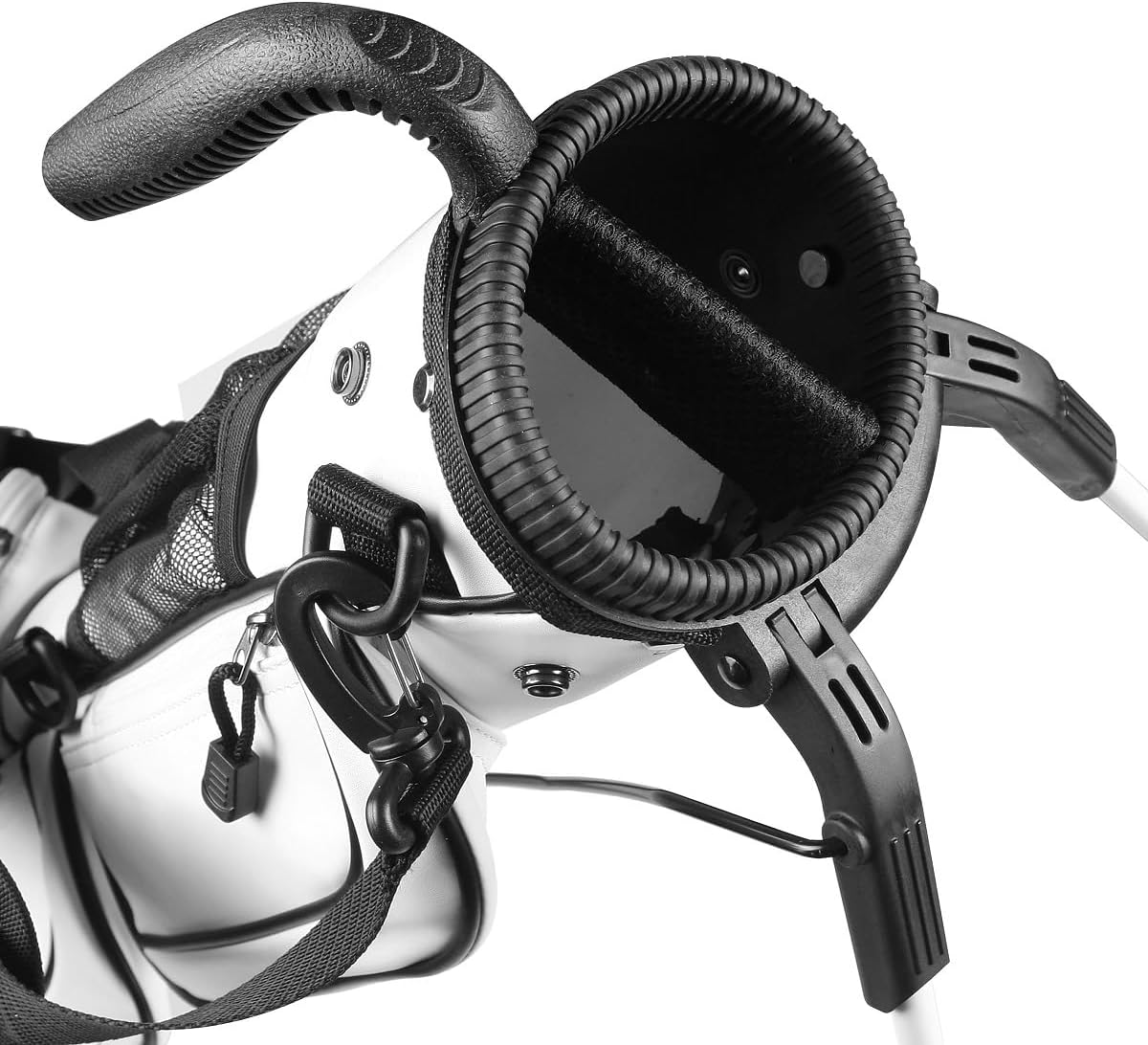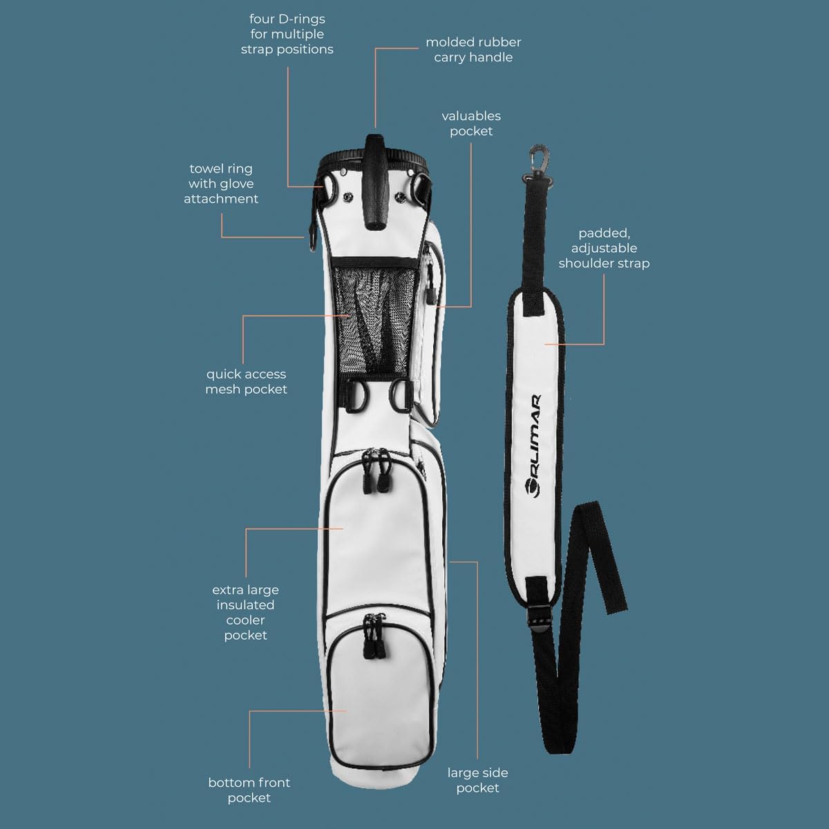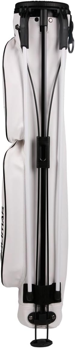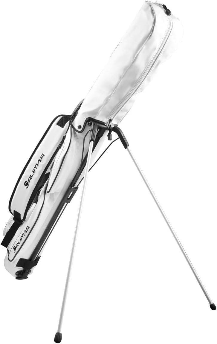 Orlimar’s Pitch N Putt Elite Sunday golf bag is ideal for a day at the driving range, or a few holes at the executive or Par 3 golf course. Manufactured with an easy to clean synthetic leather material and 5 total pockets, including an extra-large insulated cooler pocket and quick access mesh pocket. Includes a 2-Way divider top, ultra-lightweight construction, durable carry handle, detachable shoulder strap, rain cover hood, towel ring with Velcro glove attachment and strong stand mechanism.