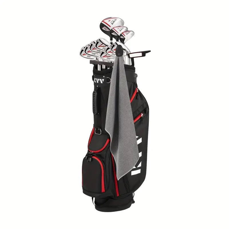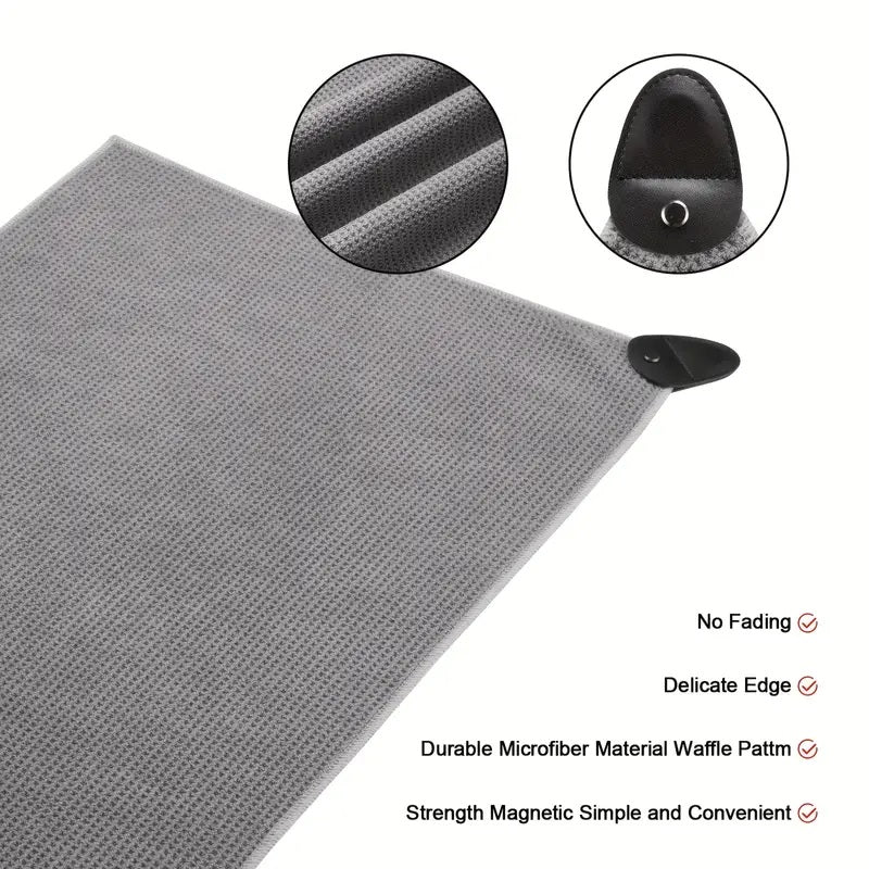 Ultra fine Microfiber towel with convenient magnet built in to attach easily to you clubs or cart.  Pick up your towel easily on the green without bending over!  Just stick your wedge or putter head on the magnet and presto!