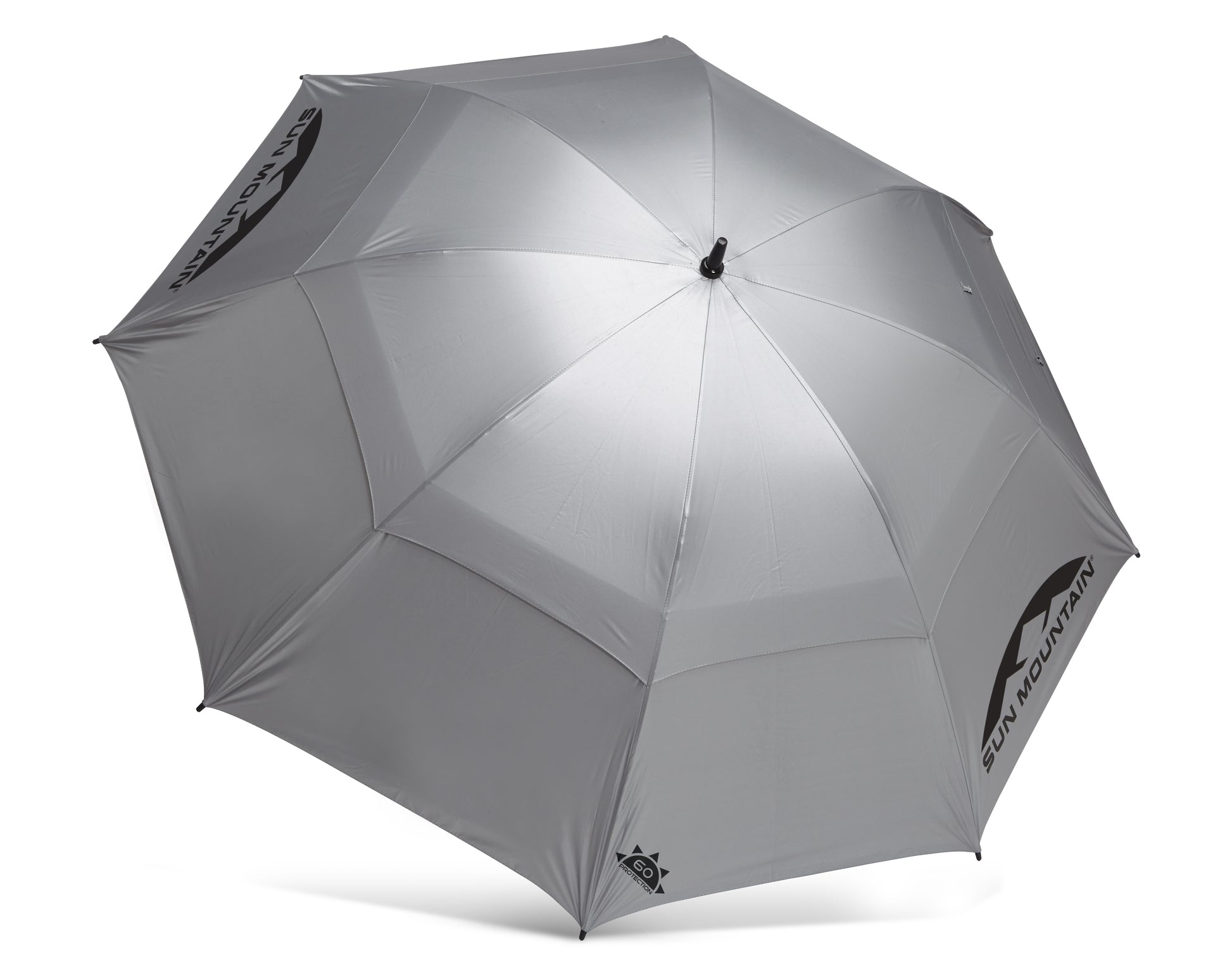 The auto-operation, double-canopy umbrella is perfect for playing golf in the rain or sun. The silver umbrella is UPF-rated 60+ and black is rated 30+. The rubber-covered, slip-resistant handle fits perfectly in the umbrella holder of Sun Mountain carts.
