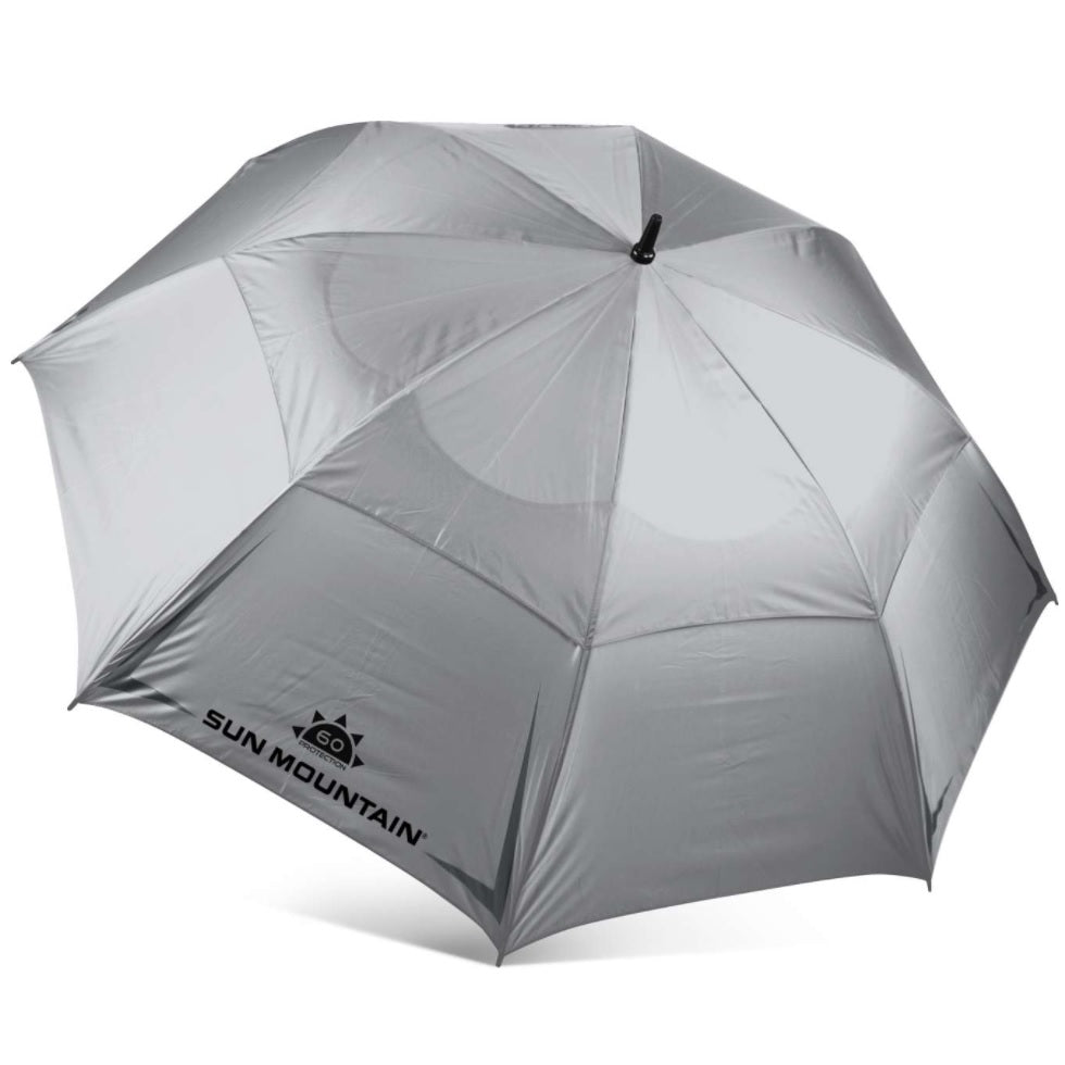 The manual-operation, double-canopy umbrella is perfect for playing golf in the rain or sun. The silver umbrella is UPF-rated 60+ and the black is rated 30+. The rubber-covered, slip-resistant handle fits perfectly in the umbrella holder of Sun Mountain carts.