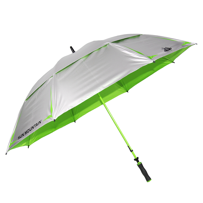 The manual-operation, double-canopy umbrella is perfect for playing golf in the rain or sun. The silver umbrella is UPF-rated 60+. The rubber-covered, slip-resistant handle fits perfectly in the umbrella holder of Sun Mountain carts.