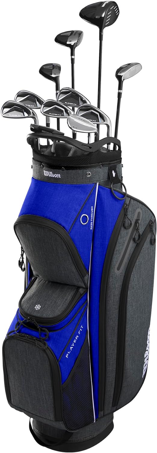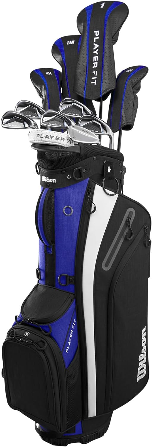 • The Wilson Men's PlayerFit™ complete golf club set has everything a golfer needs to get out on the course and flying down the fairway. This set includes a titanium driver, stainless steel fairway wood and stainless steel hybrids. Stainless steel irons (6-PW), sand wedge and a putter ensure there's the right club for every lie, from distance approach shots to the green. This boxed set includes steel shaft options for the irons, a multi-purpose cart bag along with head covers for woods, hybrids and putter.