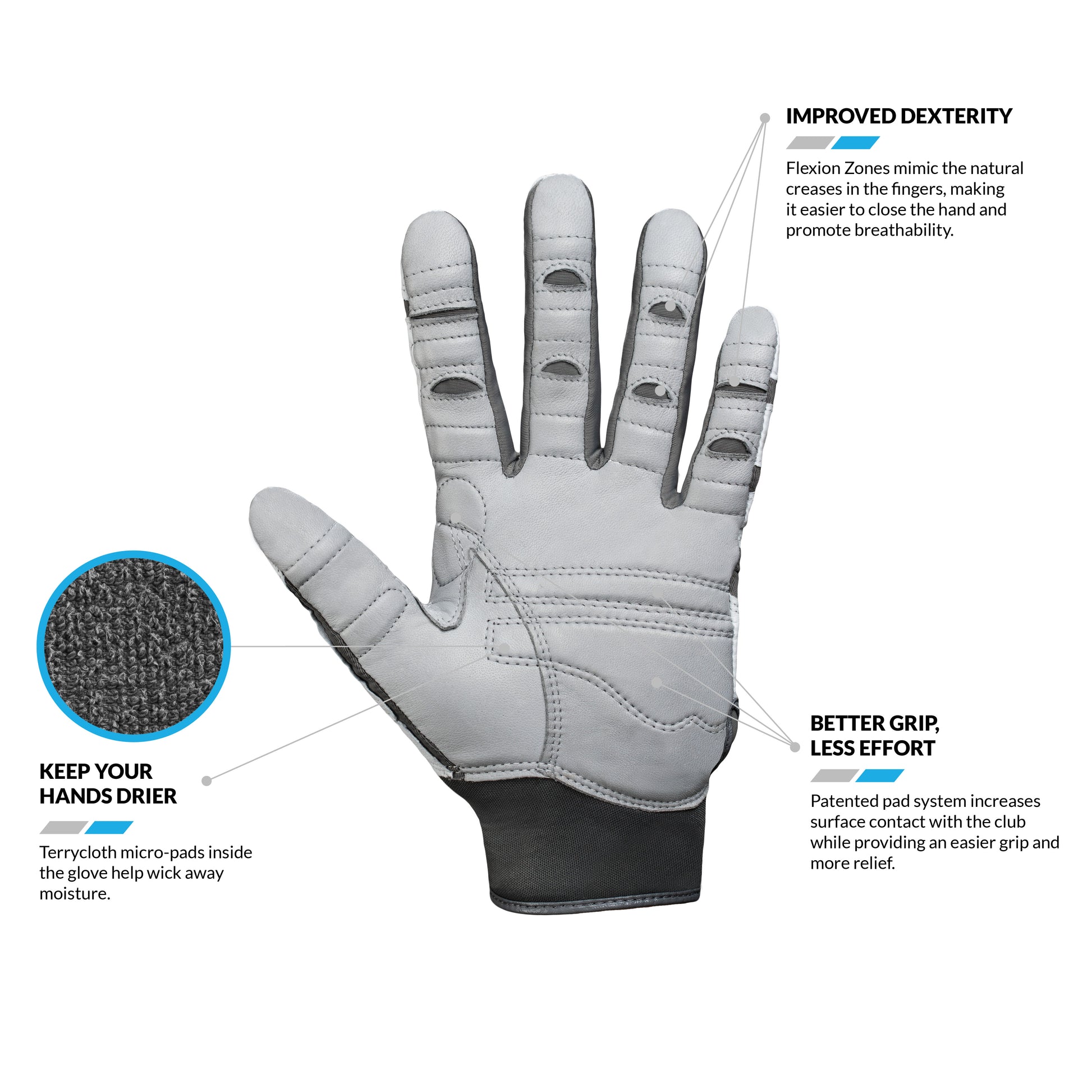 Keep Your Hands Drier- Terrycloth micro-pads inside the glove help wick away moisture.