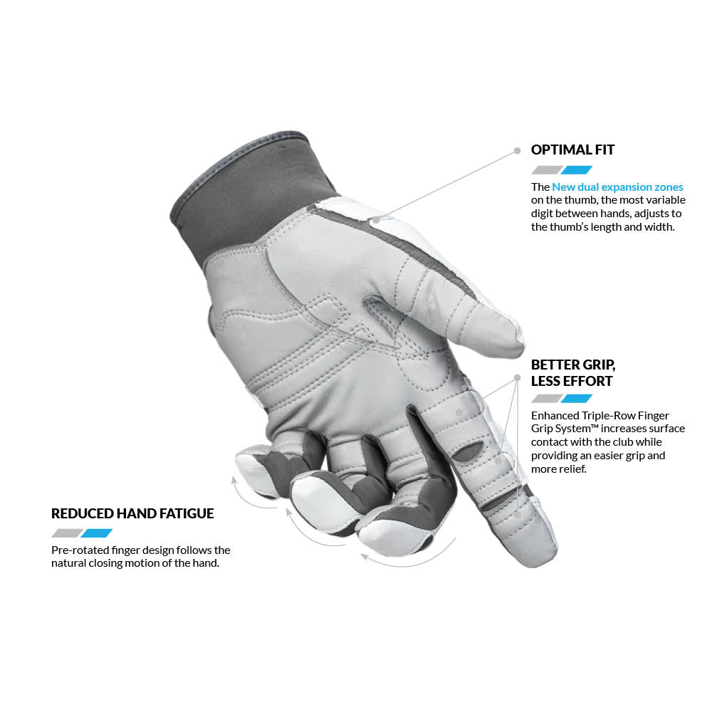 A better grip means better control over your game! The ReliefGrip® 2.0 golf glove features the NEW form fitting Dual Expansion Zone Thumb that adjusts to fit any size thumb (the most variable digit between hand sizes). A more custom fit and enhanced comfort offers better performance throughout your round. Experience increased support and control with our ergonomic LitePrene™ wrist closure and Triple-Row Finger Grip System™.