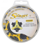 Champ Scorpion Stinger Cleats - Small Metal Thread Enjoy improved performance traction with the enhanced cleat technology found in the Champ Scorpion Stinger Cleats. These cleats come with an innovative wear indicator so you will never lose precious traction. The bottom of the cleats are equipped with a black C that turn solid when the cleats need to be replaced. Additional features: Soft durometer TPU for superior comfort and durability Green-friendly design minimizes marks on the green Wrench holes formed in rigid material Center C visible wear indicator turns solid when cleats need to be replaced Primary spring-flex traction elements provide optimum gripping ability Includes 22 cleats Small Metal Thread cleat system