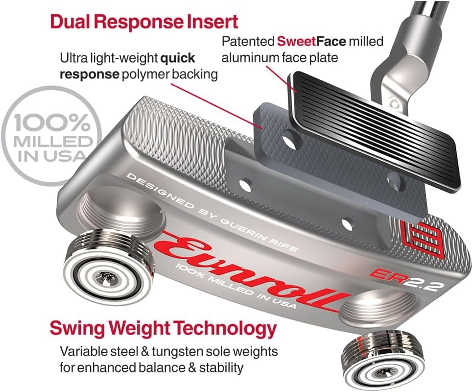 A heel and toe weighted blade design. The ER2.2 features the same plumber-neck hosel of the ER1.2 while borrowing its head shape from the ER2 and features a blade style perpendicular setup at address but with an extended sight line for target line alignment. Available in right hand.