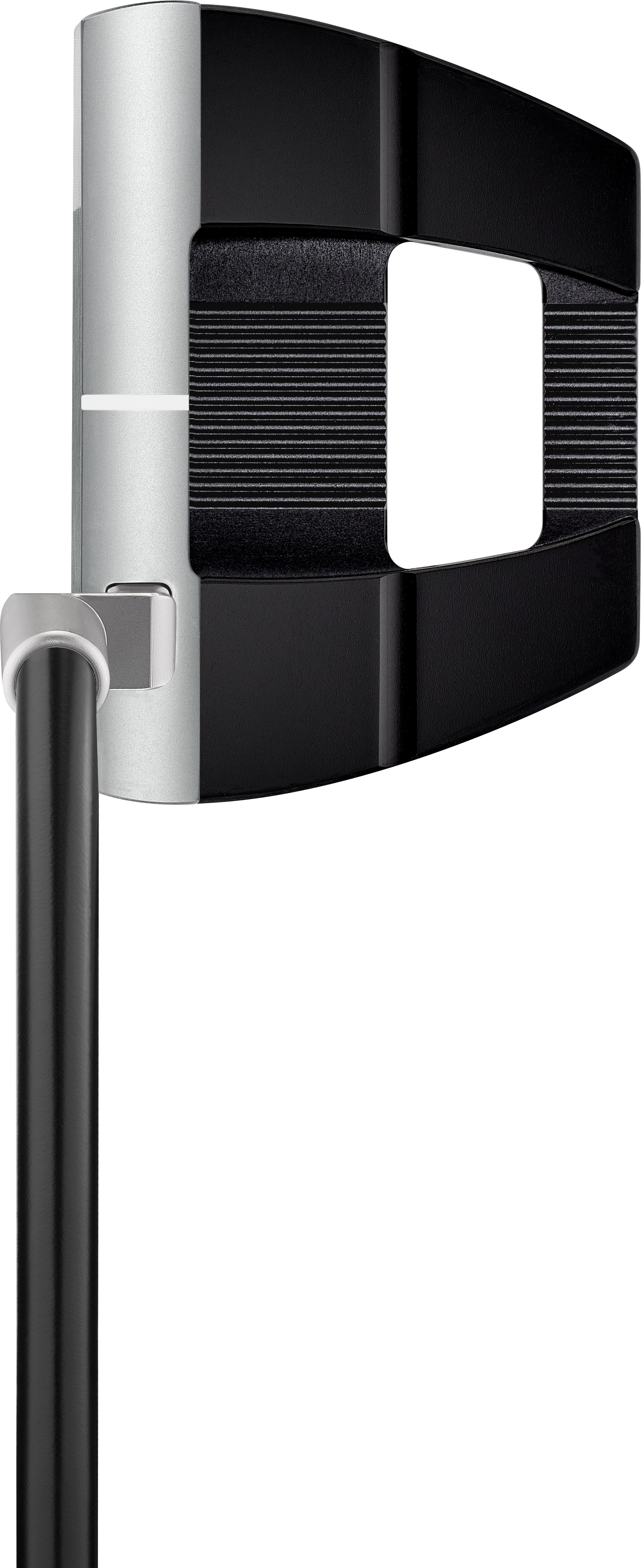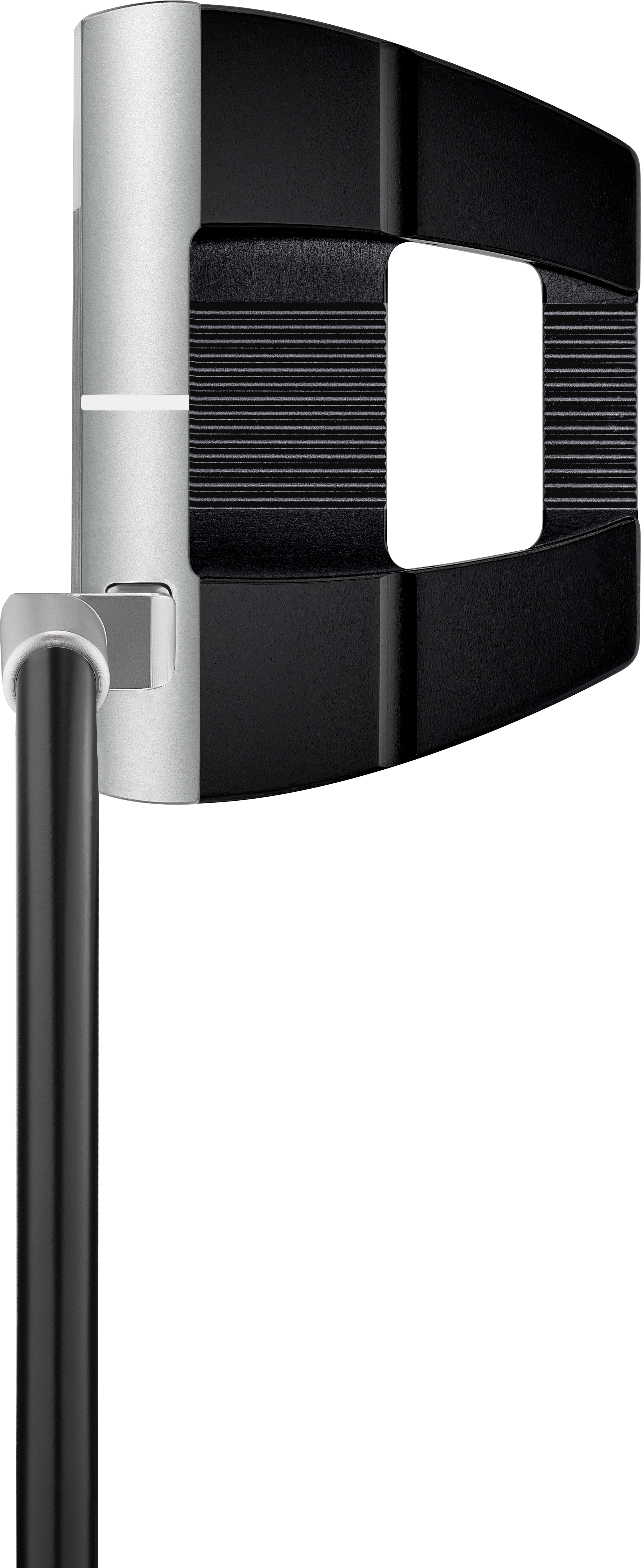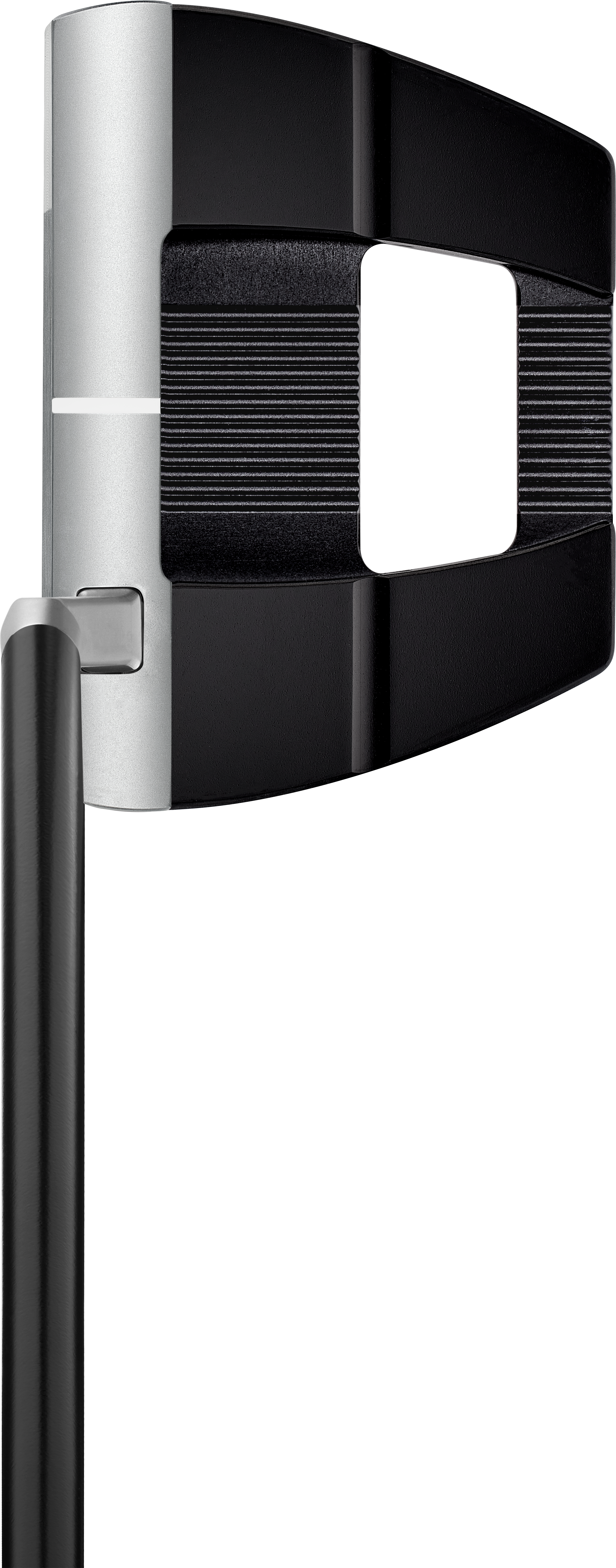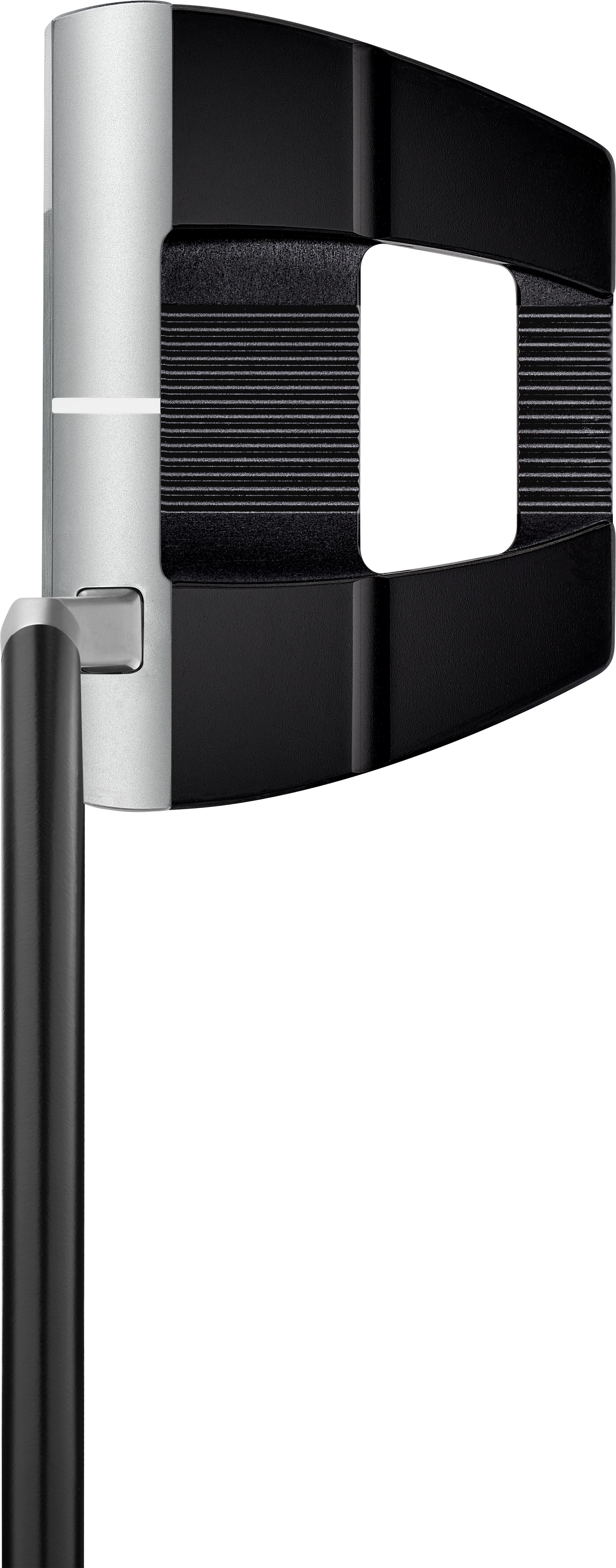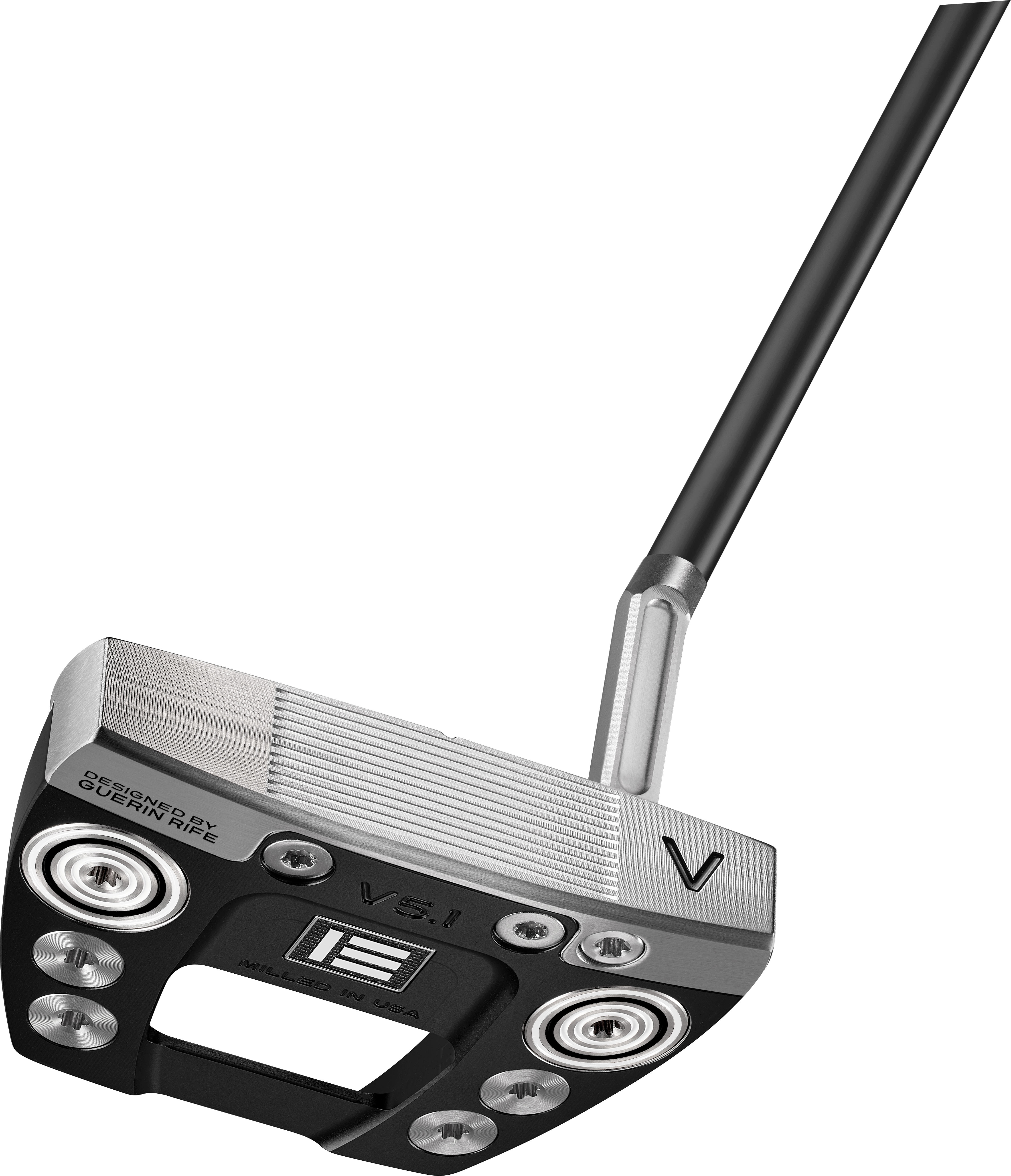 Essentially the shape of a blade putter, the stainless steel face and front section of each putter provides the feel of a blade from the hitting area while the rear aluminum chassis and four tungsten weights positioned deep and low offer the CG and MOI benefits of a mallet.